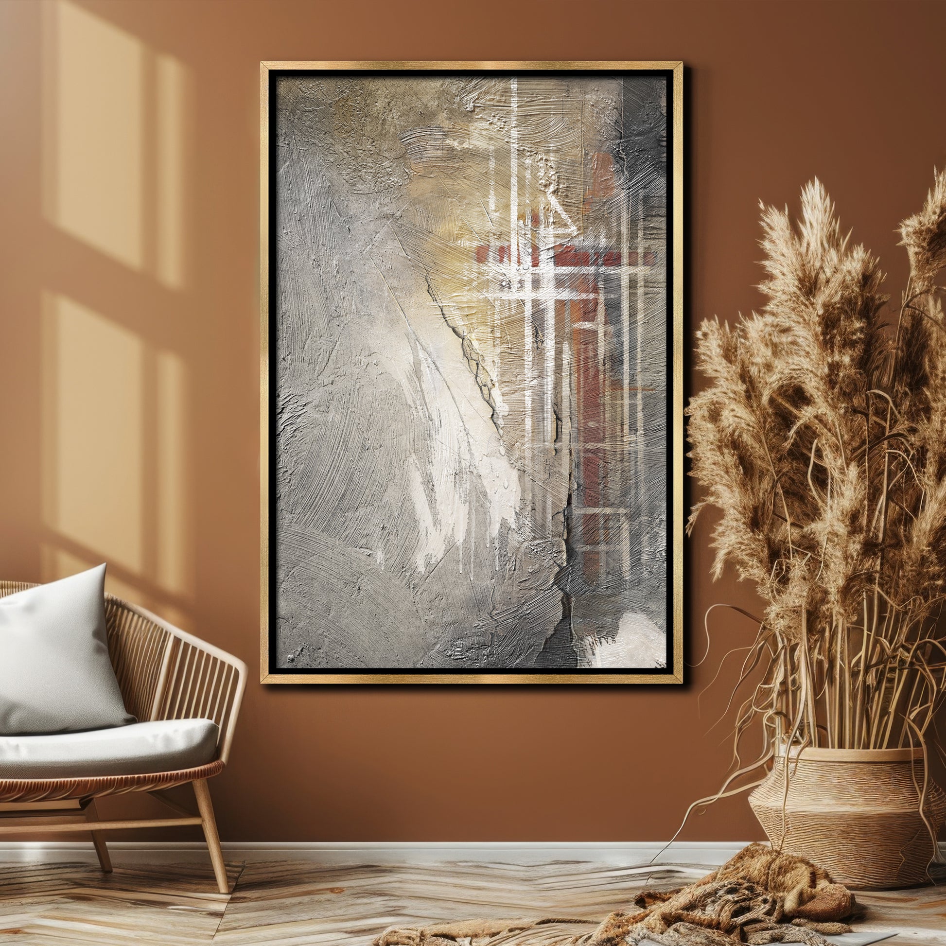 "Crimson Veil Whisper" embodies a balance between subtlety and power, featuring layers of rich red and dark tones delicately blended to evoke a mysterious allure. The fine texture of soft crimson sweeps through dark, muted backgrounds, creating a sense of depth and hidden beauty. This abstract piece transforms any modern interior into an elegant, moody space.
