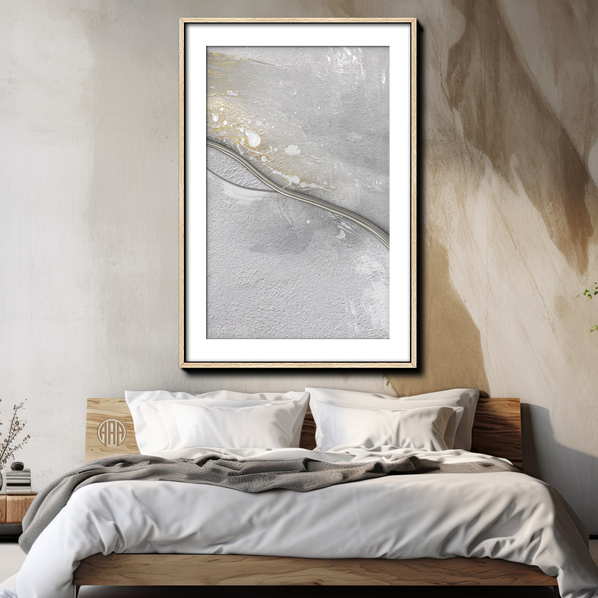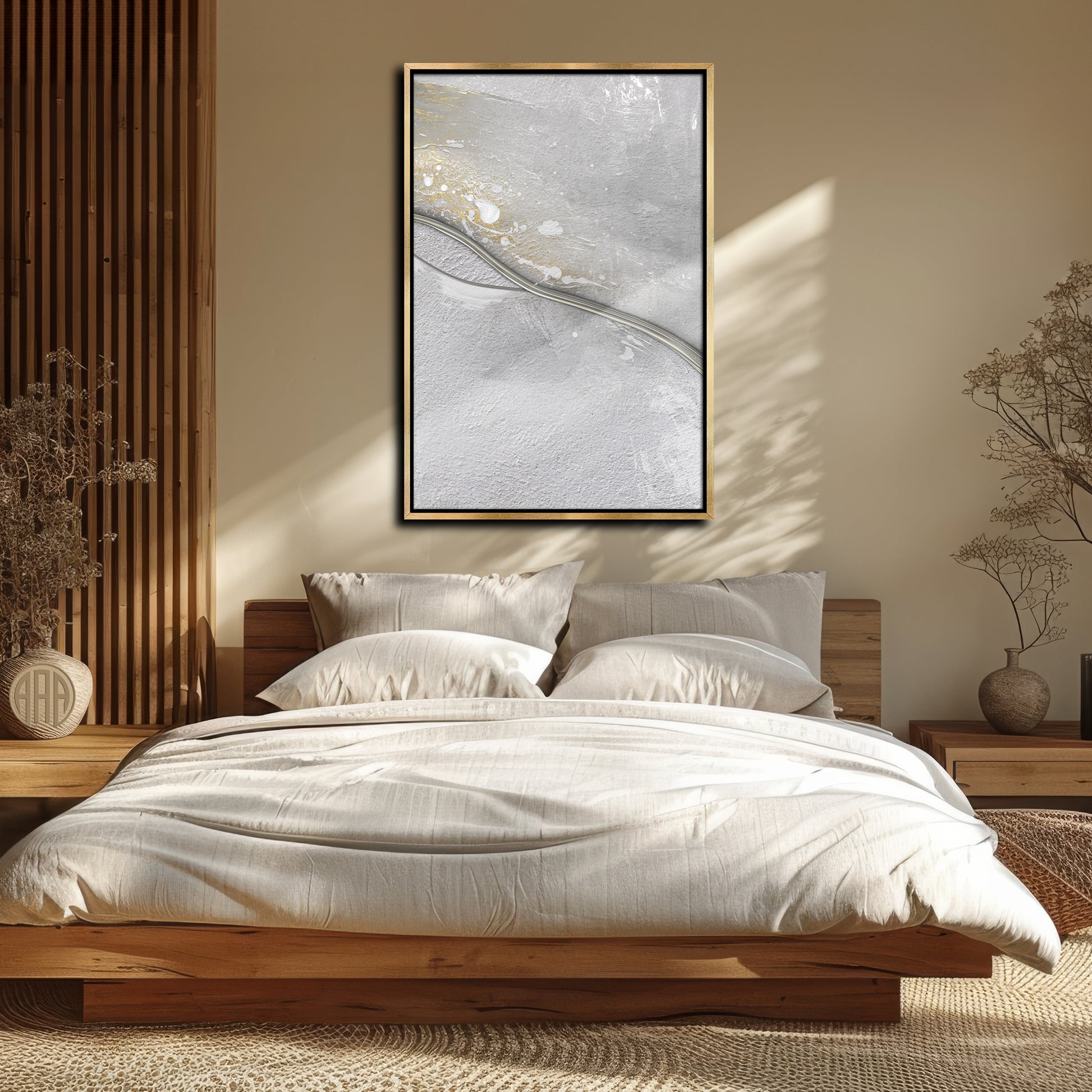 "Ethereal Gold Path" invites you on a journey through its shimmering gold tones, gracefully flowing across a textured backdrop of soft whites and warm neutrals. This piece captures a dreamlike quality, where rich hues and delicate textures harmonize, creating an atmosphere of elegance and tranquility.