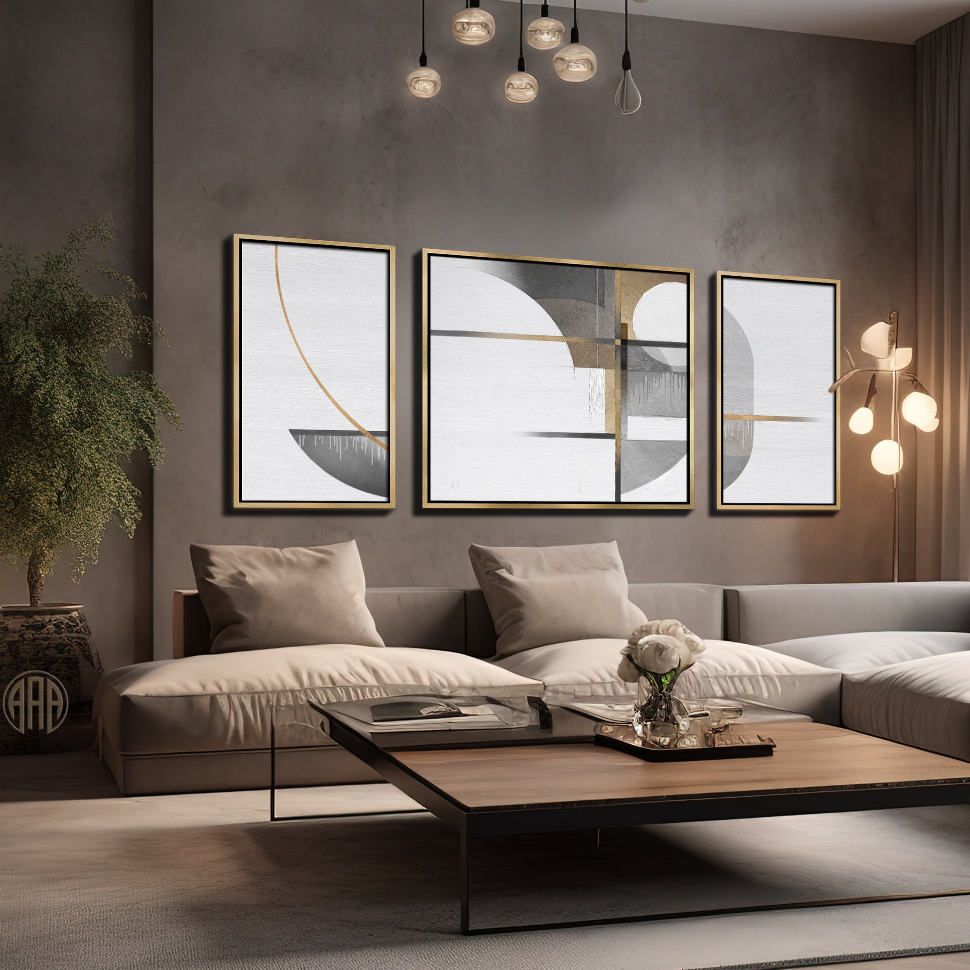 As the centerpiece of a striking triptych, "Golden Flow" is a mesmerizing composition that showcases a radiant stream of golden hues flowing gracefully across a soft, neutral backdrop. The interplay of light and texture evokes a sense of movement and tranquility, inviting viewers to explore the depth and warmth of its colors.