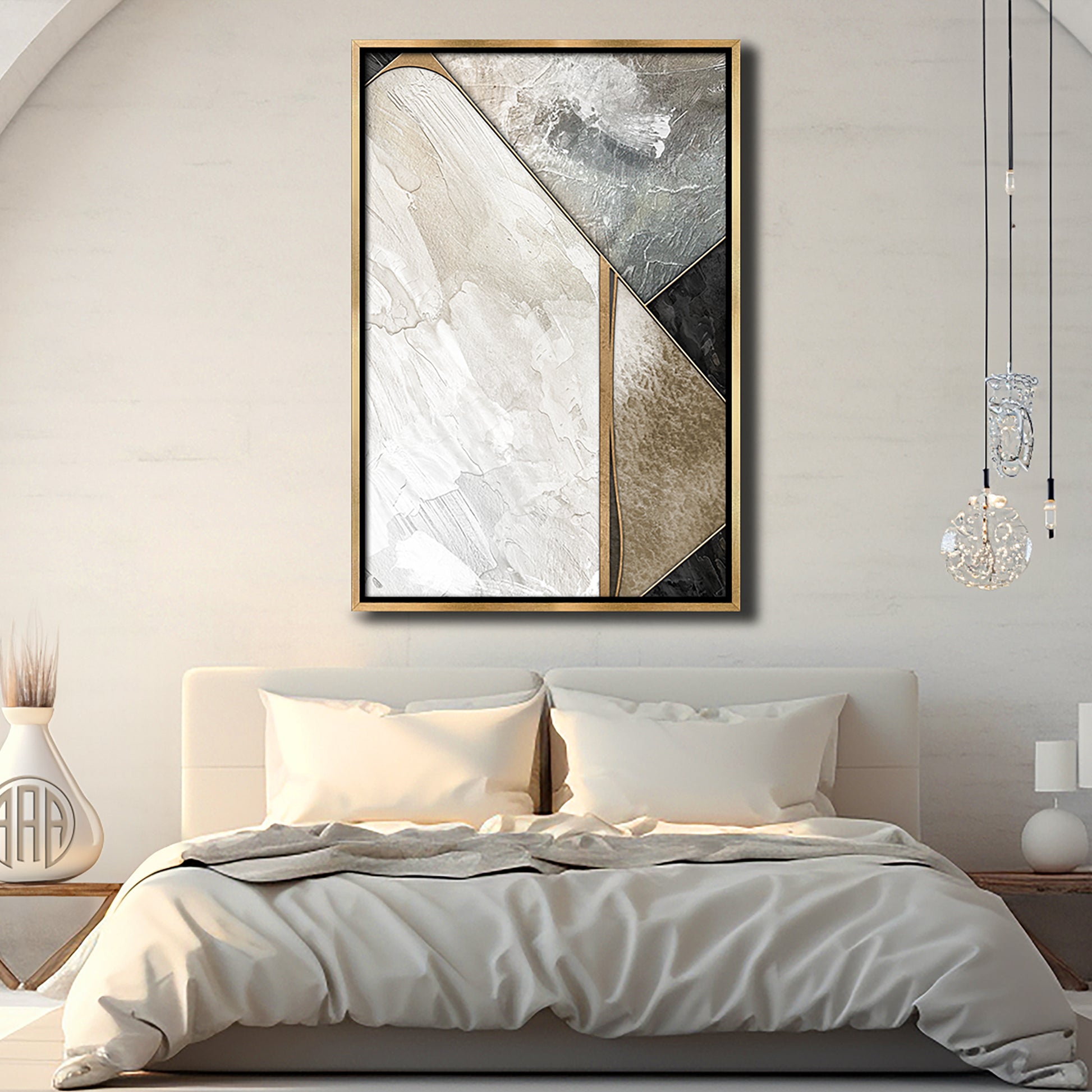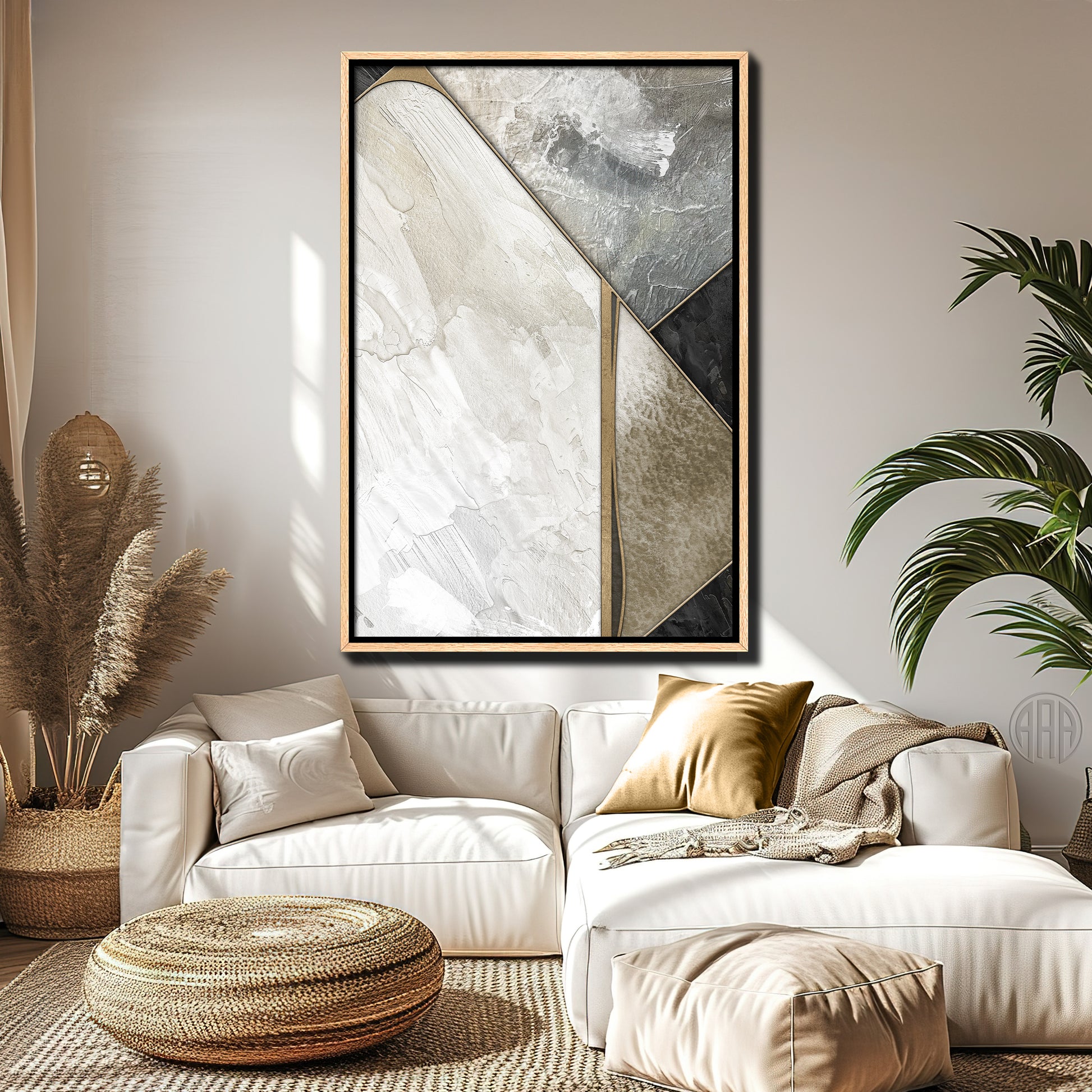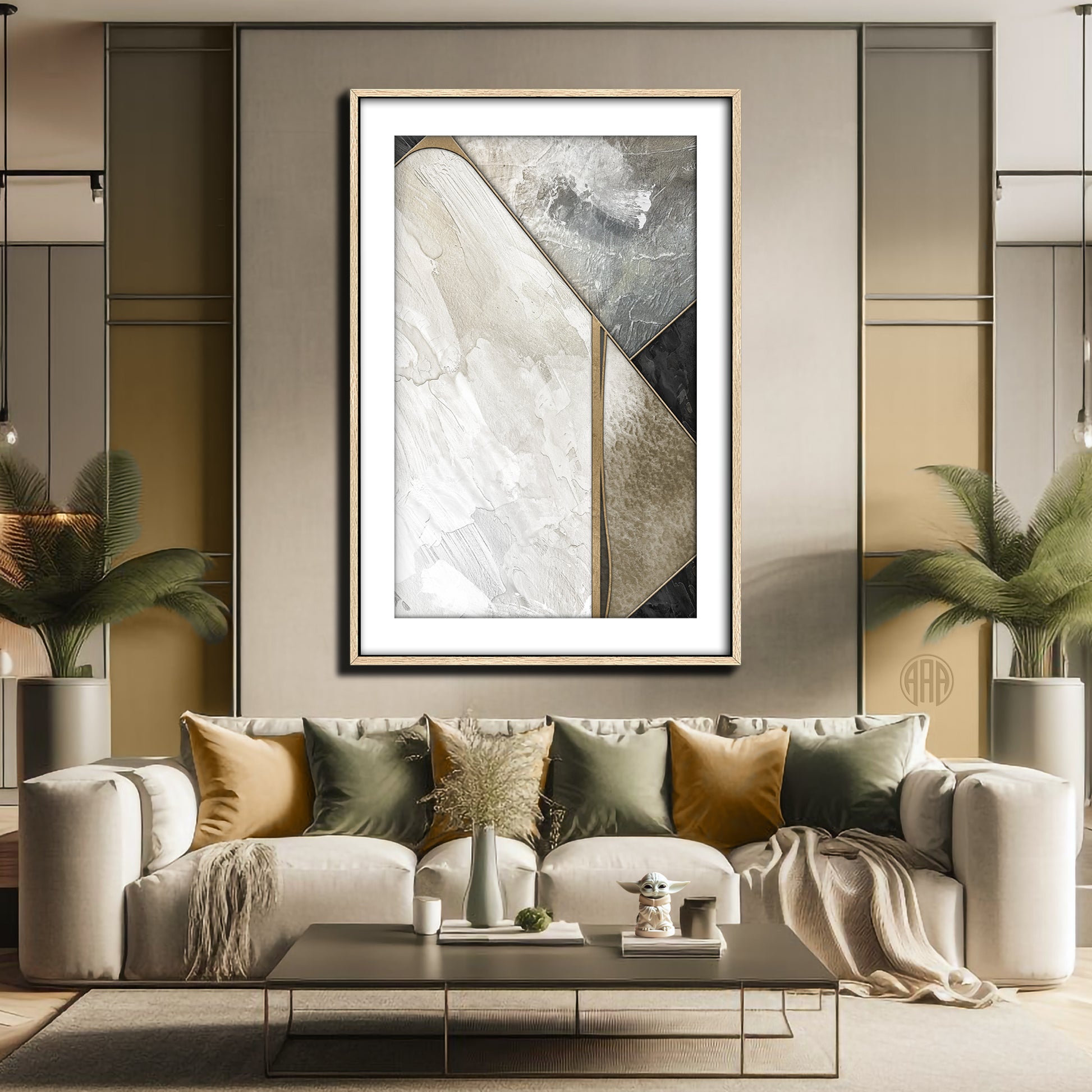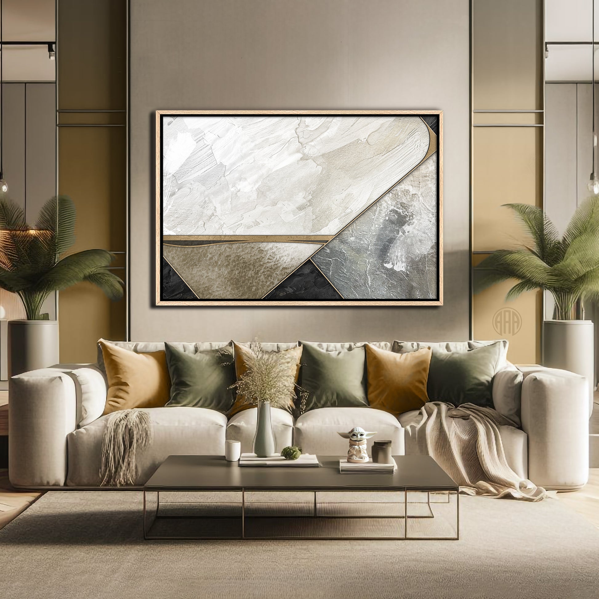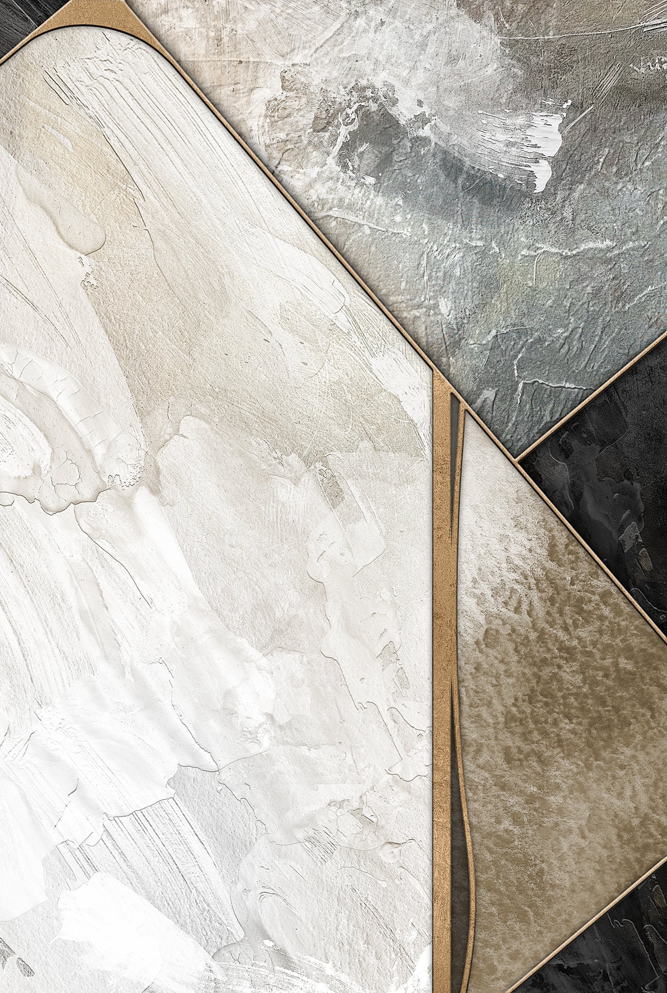Sharp Desire This piece pushed my usual style. Playing with sharper angles and graphic contrasts. I layered whites, blacks, and earth tones, then cut through it all with sleek gold lines to add a sculptural edge.