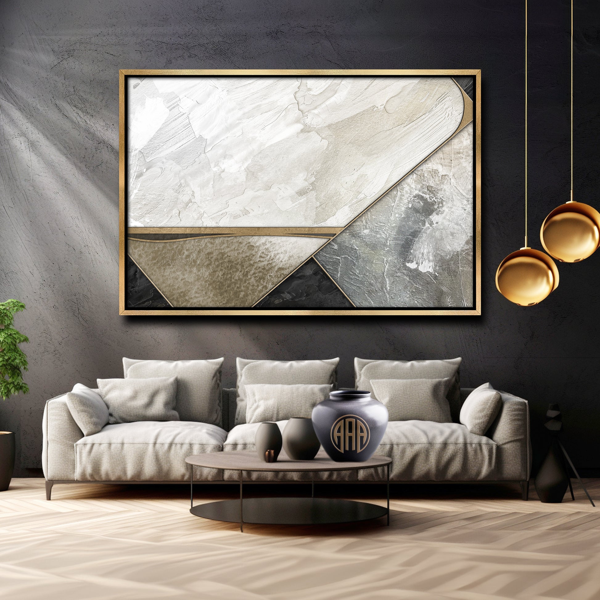 Perfect for modern interiors, this geometric abstract brings energy and sophistication to any room. It balances boldness and restraint. Great for entryways, offices, or living rooms looking for a clean, luxe focal point. I currently have this one hanging in my foyer.