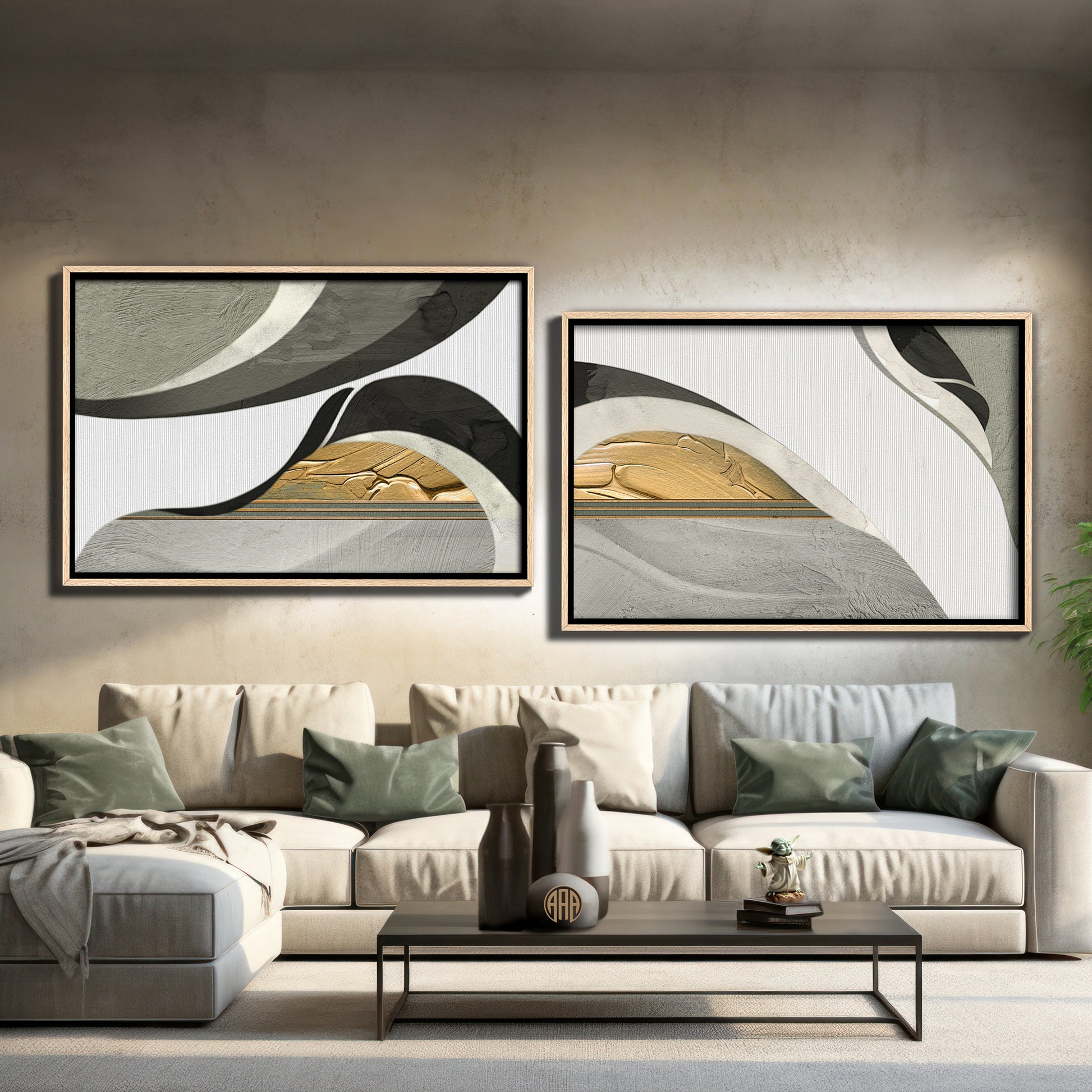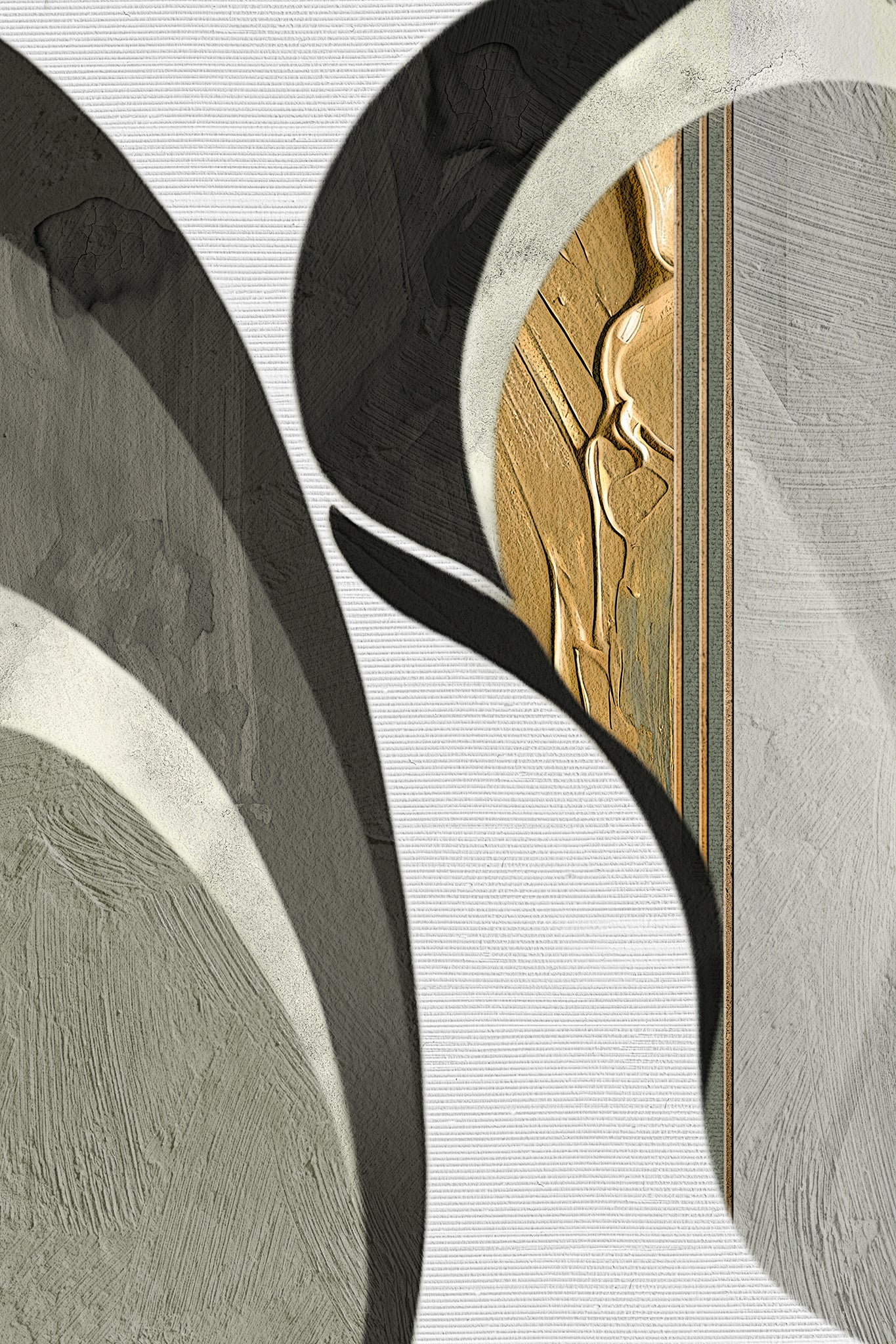 Tempting Entanglement 3 is a versatile artwork that shines as a single piece or in concert with its counterparts, “Tempting Entanglement 1” and “Tempting Entanglement 2,” allowing for endless creative possibilities in your home decor. This captivating composition features waves of white, off-white, and slate cascading over a light sage backdrop, characterized by thick brush strokes. Rich, thick gold oil paint strokes add a touch of opulence.