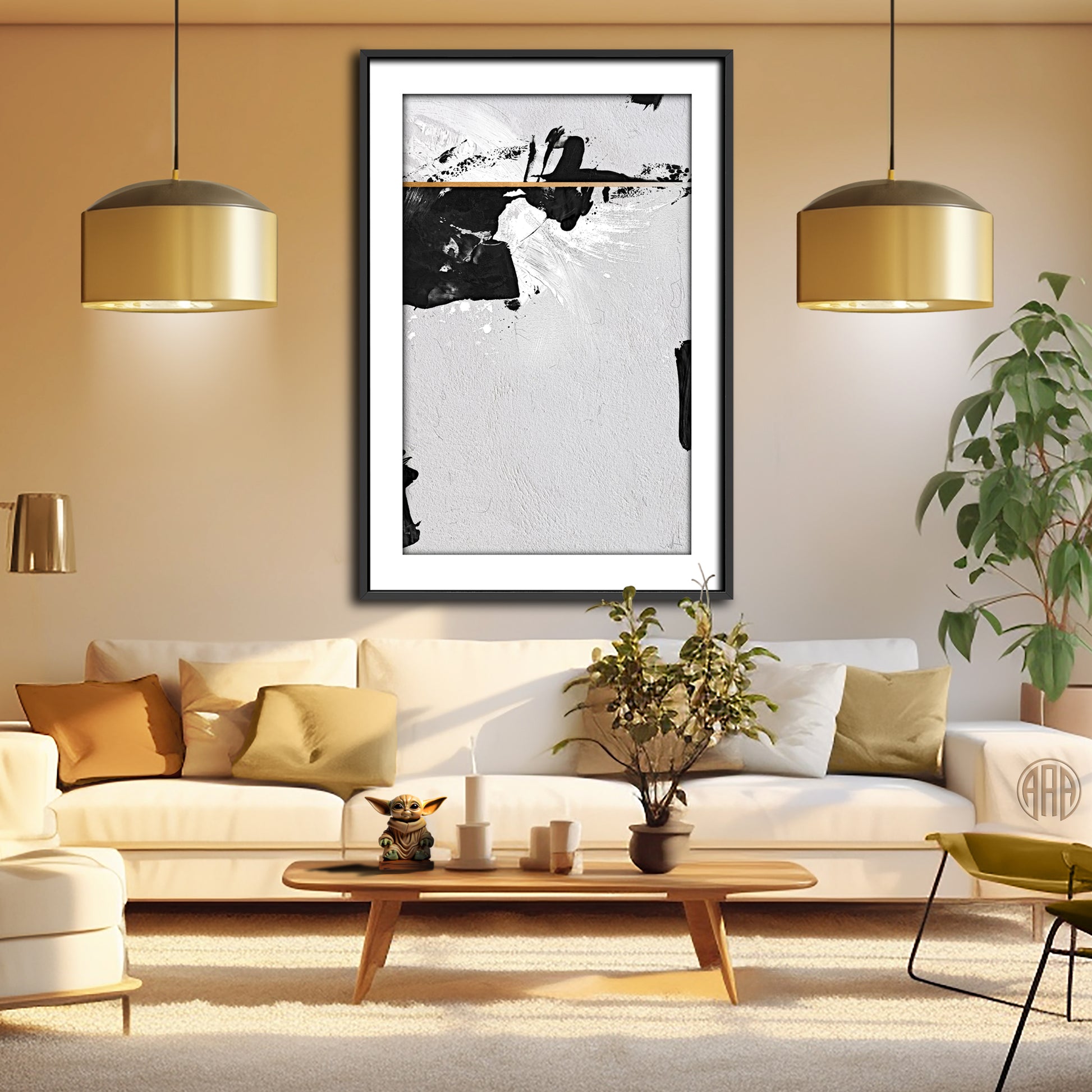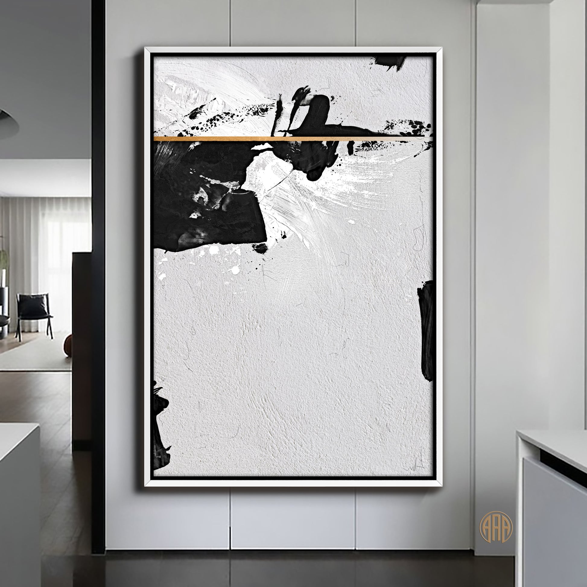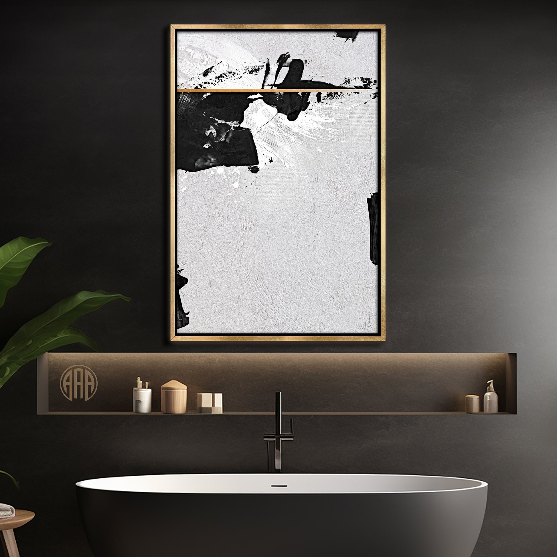 “Whispering Gold 2” is a stunning piece that stands out beautifully on its own or makes a striking impact when displayed as a diptych. Featuring a textured white background, it is overlapped by fluid, with black sections, creating a bold contrast. The artwork is accentuated by a slender horizontal bar of rusted gold and dark slate, adding an element of sophistication that enhances any modern decor.