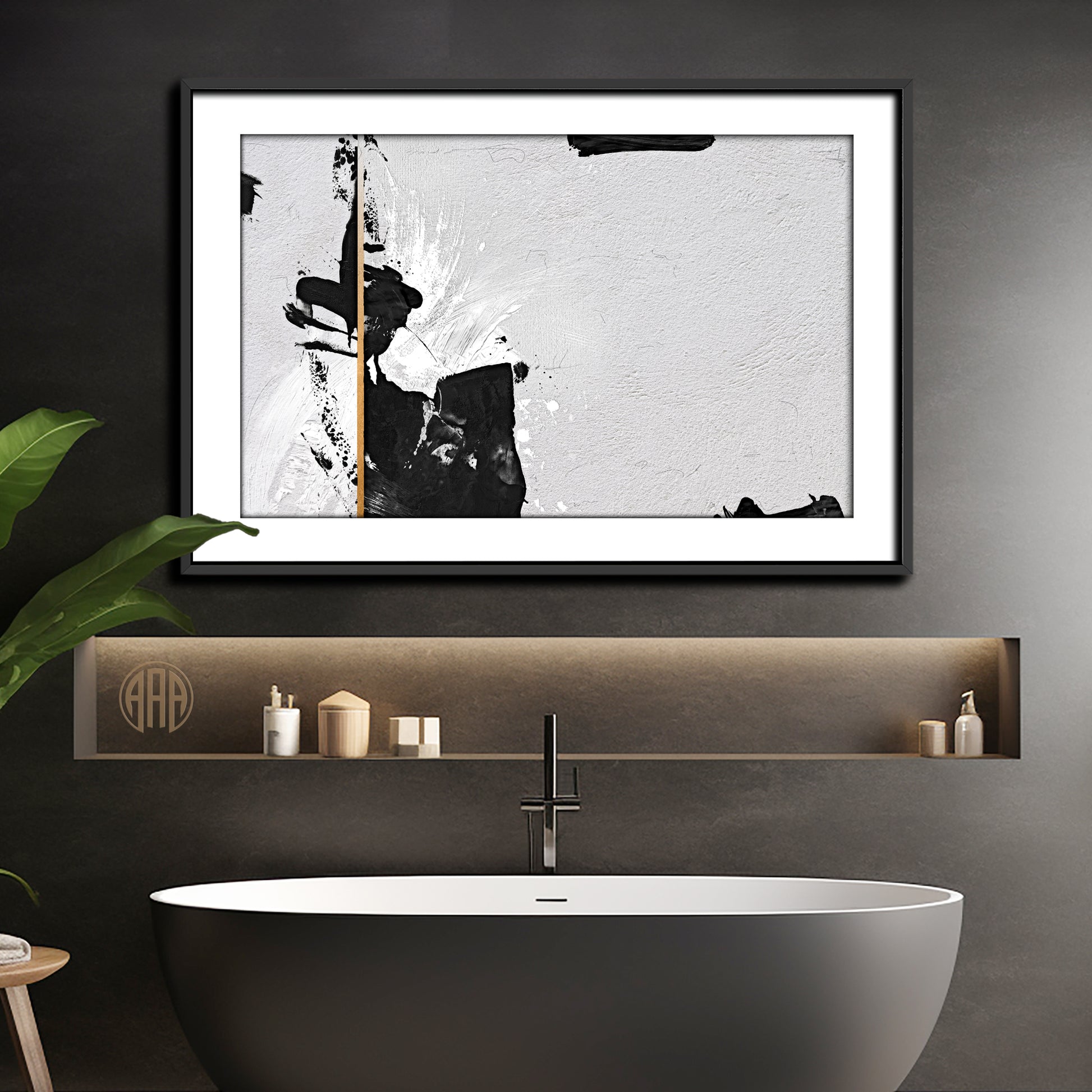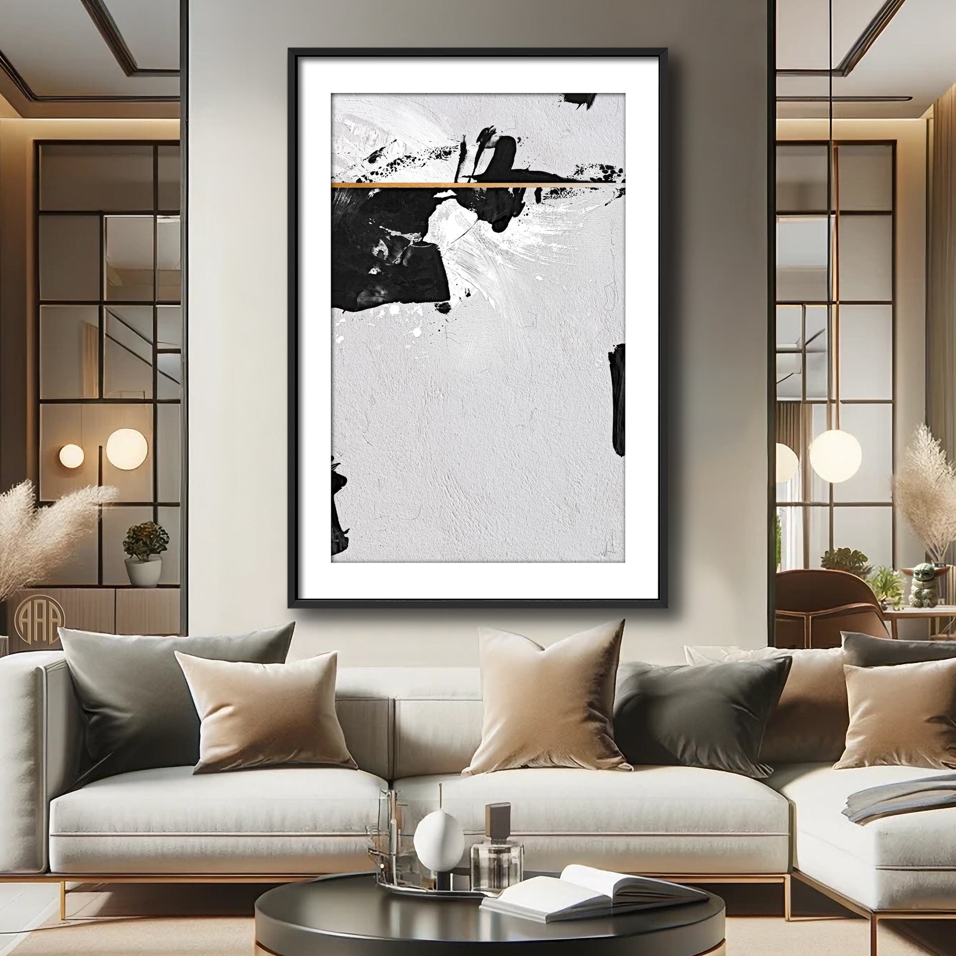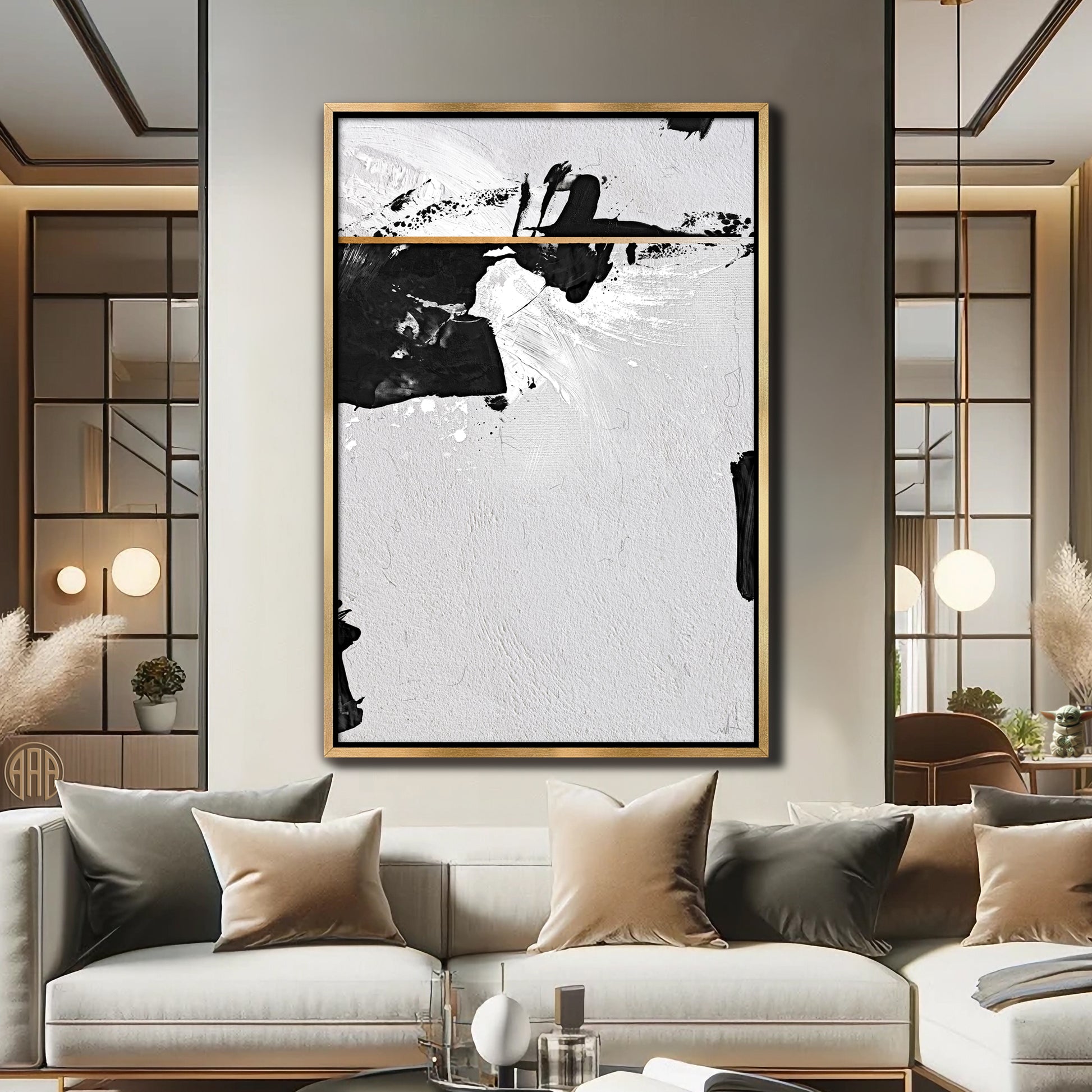 “Whispering Gold 2” is a stunning piece that stands out beautifully on its own or makes a striking impact when displayed as a diptych. Featuring a textured white background, it is overlapped by fluid, with black sections, creating a bold contrast. The artwork is accentuated by a slender horizontal bar of rusted gold and dark slate, adding an element of sophistication that enhances any modern decor.